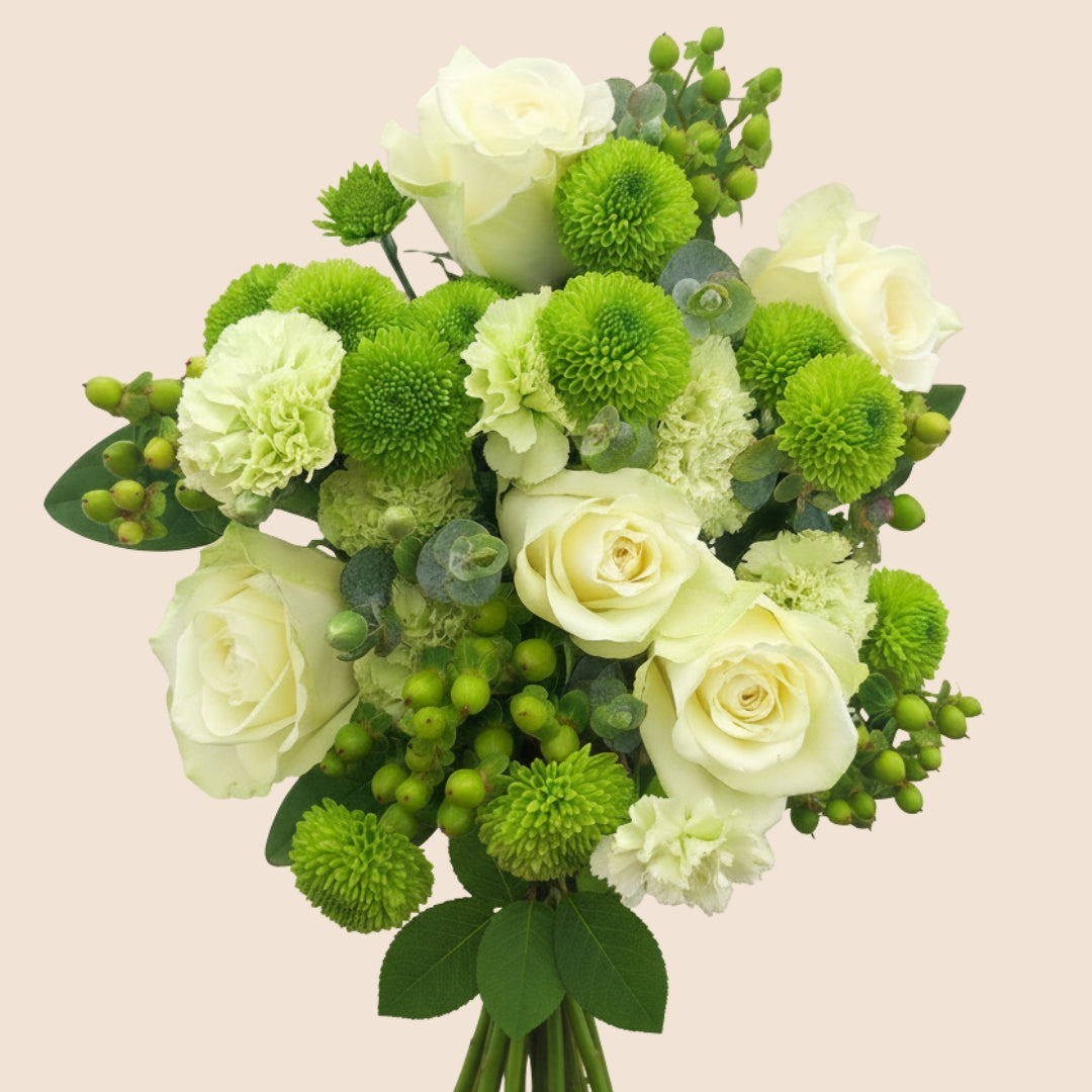 Le Bouquet Nature est l'incarnation de la tranquillité et de l'élégance minimaliste. Avec ses teintes blanc immaculé et vert feuillage, il apporte une touche de fraßcheur apaisante à n'importe quel intérieur ou événement.